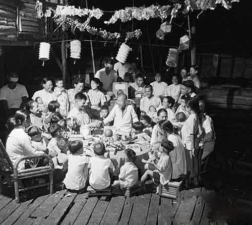 这是20世纪50年代,81岁的老渔民郭汝一家四代同堂共55人在中秋节夜大团聚。