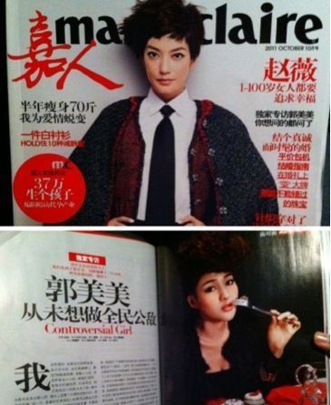 近日,郭美美接受某时尚杂志专访,并专门拍摄了一组时尚写真。该杂志一面世即引发网友反感情绪,纷纷声讨该杂志“有没有道德底线”,抗议让郭美美进娱乐圈。图为郭美美和嘉人杂志