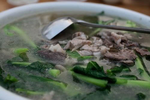 大排档坐落在一条村子的路口,村里有不少宰猪为生的人家,老板是村里人,收购村里的猪杂在村口作生意,生意好得很,一天到晚都有人光顾,不分早餐、午饭和晚饭,大伙来那儿吃的是什么呢? 当然是猪杂汤。