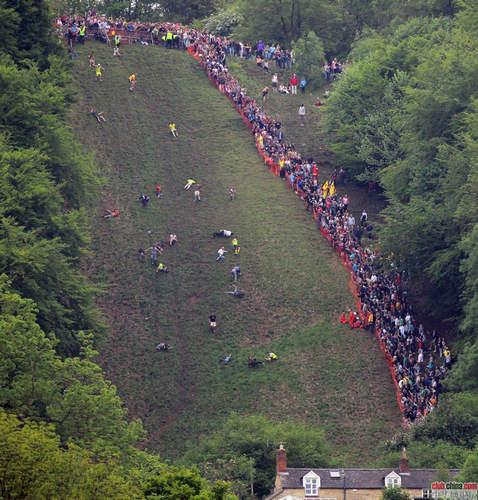 <br> <br> 时间:2009年5月25日<br> <br> 地点:英格兰,格洛斯特郡,库伯山<br> <br> 许多参赛者在陡峭泥泞的库伯山追逐从山上滚下的奶酪。 <br> <br>