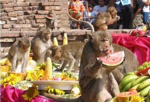 <br> <br> 时间:2009年11月<br> <br> 地点:泰国,洛布里<br> <br> 大约有600只猴子被邀请来参加这个活动,他们尽情地享受两吨的烤香肠、新鲜水果、冰激凌和其他食物,据说这是当地人为了感谢猴子给当地的旅游业做出的突出贡献而设计的。 <br> <br>