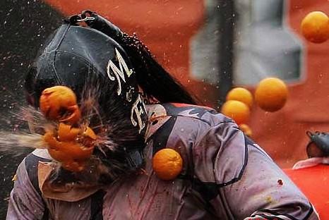 <br> <br> 时间:2010年2月<br> <br> 地点:意大利,伊夫雷亚<br> <br> 意大利伊夫雷亚镇每年都要举办一场“桔子大战”,用桔子互相投掷,以模仿中世纪意大利仇家之间的角斗。参加者9人一组,与另一组进行对抗,可享受免费的豆类食物来保持体力。 <br> <br>