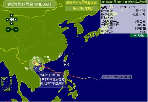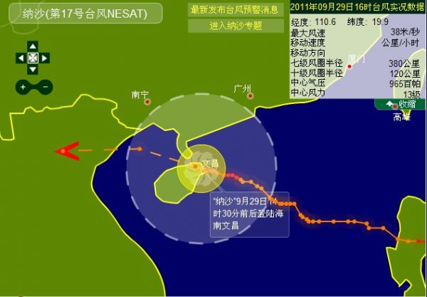 9月29日16时:台风“纳沙”位于海南省海口市境内,即北纬19.9度,东经110.6度,中心附近最大风力13级(38米/秒),中心最低气压965百帕。