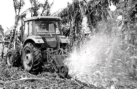 徐闻县新寮农场,一辆胶轮机拉着粉碎还田机正在已收获的蕉园工作,机过之处,香蕉树碎片飞扬(如图),不到一小时,2.8亩的香蕉树、叶全部“化为乌有”,香蕉园被清理成为一块空地。这就是和安镇下尾仔村农民邓尾制造的新型香蕉树粉碎还田机。