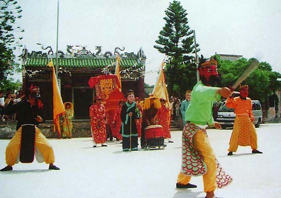 傩舞本是一种历史悠久的中原传统文化,原来是用以祭神驱疫,在粤西这片土地上则演变为民间的祈福活动。雷州的傩舞又名“考兵”,分成红黑两支队伍,由各自的将领统帅,两队之间由一名道公牵引。第一道舞是道公发令,众人“练兵”;第二次起舞是两队人马拼打,意在驱魔,最后道公再请雷神下凡保佑全村。