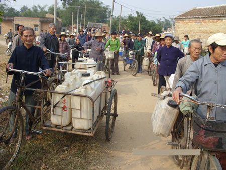 自2003年开始,村民们每天都要来回6公里前往镇政府取水。即使年纪七八十岁的留守老人也不得不每天蹒跚6公里用手推车取水。农忙时,一些家庭的取水重任就落在了10余岁的孩子身上。不少老人和小孩因取水而摔伤。村民们告诉记者,2008年,77岁的吴华权老人骑着人力三轮车从界炮镇政府载着两桶水回家时,在下坡处摔倒,肋骨折断插进肺部,抢救无效死亡。