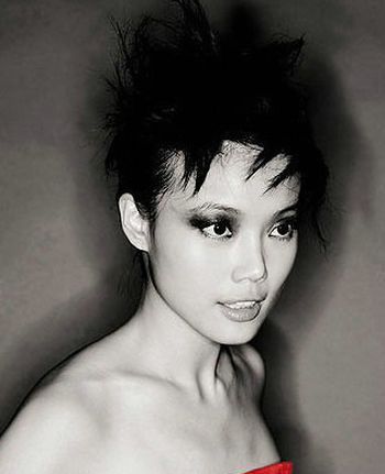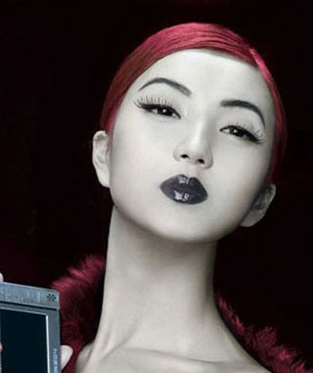 陈好的这款妆容有点日本艺妓的味道——惨白色的脸,黑色的唇彩、线条夸张的超长眼睫毛,故意将眼睛画得又细又长,突出东方单眼皮女人的韵味。玫瑰酒红色的头发和指甲在白色肌肤的映衬下特别显眼。
