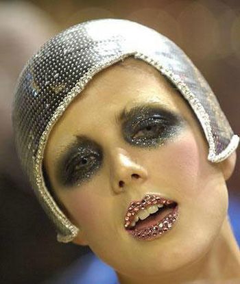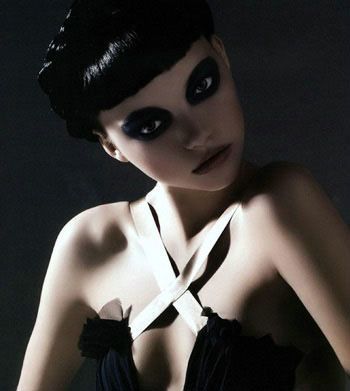 时尚偶像阿格妮丝·迪恩 (Agyness Deyn)的这款闪亮的熊猫妆凸现了眼部和唇部,自然色粉底,以淡粉色腮红稍在颧骨处作修饰,妆容的重点在于眼部的夸张熊猫烟熏眼影,充分体现出“哥特式”眼妆的特色,眼影上的闪粉将暗淡的眼部提亮,唇上贴钻更增添了“嗜血”气息。