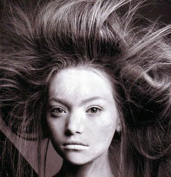 刚说吉玛·沃德的babyface很难做出恐怖效果,这款惨白妆就出炉了。有人戏称这是一款“灰面”妆,因为看上去好像彻头彻脸沾了一层厚厚的灰面,如此纯真的一张娃娃脸变得毫无血色,配上蓬乱的头发,还真有点摄人。