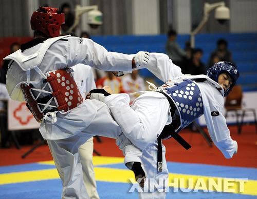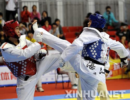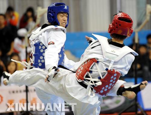 21日,在江西景德镇举行第七届全国城市运动会跆拳道男子80公斤级决赛中,湛江队选手陈明获得冠军。