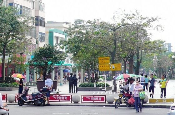 在一条本来让人休闲购物的步行街口,却戒备森严地示着一排告戒牌,令人很受压抑。