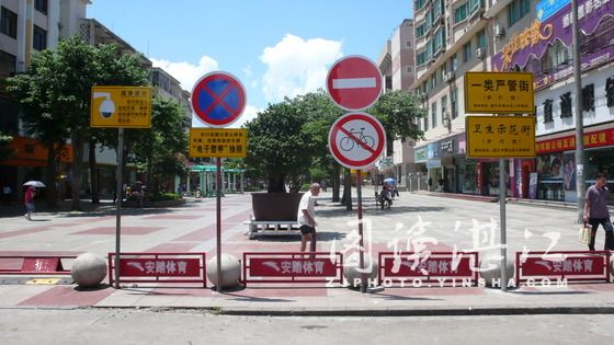 今年7月份,霞山步行街位于文明路一侧的街口铁栏上,示起了一排像“包公审案”时立着的肃静牌。这些牌子第一张是视频监控的“温馨提示”,写着“您已经进入监控区域,请您自觉遵守城市管理法规”;第二张是“电子警察”,写着“步行街路口禁止停放车辆,违章停放的车辆电子警察拍照”;第三张是两个自行车禁行标志;第四张是告知牌,内容令人哭笑不得,已经是十年历史的步行街,却唯恐别人不知,在牌子上写着“一类严管街(步行街)”和“卫生示范街(步行街)”的字样。
