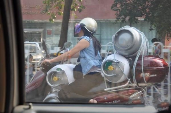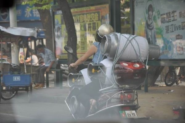 赤坎强大姐,电动车载四个煤气罐飞奔