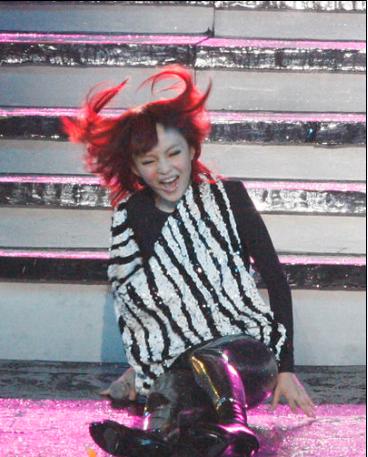 <br> <br> 脚踩十厘米细高跟的张韶涵就没有那么走运,她走下舞台台阶时不慎滑倒,重重坐到了地上,意外发生后,她继续演唱,全程面带微笑。<br> <br>