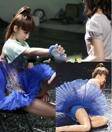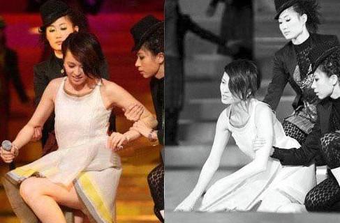 <br> <br> 梁咏琪表演过程中意外脚软摔倒,由舞伴搀扶住,可是最终还是跌坐地上……尴尬!<br> <br>