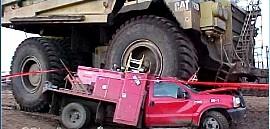 <br> <br> 这场事故发生在加拿大阿尔伯塔省Fort McMurray镇的一个露天原油矿井(该地区有丰富的油砂资源)。重型矿车的司机当时正在驾驶室利用中间休息的一段时间吃午餐。此时一辆红色的小型货车出了故障,电焊工把它开到矿车前面不远处停车准备修理。不幸的是,他停车的位置是矿车司机的盲区。<br> <br> <br>