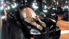<br> <br> 美国明尼苏达州Wayzata,101号高速公路,一只鹿正在桥上行走时受到从旁边经过车辆的惊吓,纵身跳桥而下。恰在此时,一辆道奇Durango正在从桥下通过,司机瞬间记住了“祸从天降”是什么意思。结局:鹿死得刚烈,人受点轻伤。<br> <br> <br>