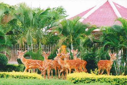 金鹿园的梅花鹿是1972年从东北引进的,经过20多年的努力,已经成功解决了北鹿南养的一系列技术难题,原先引进的43头种鹿已繁育出后代鹿1800多头。金鹿公司现有存栏鹿715头,是华南地区规模最大的梅花鹿养殖基地和鹿场。金鹿园是生产、观赏、销售三位一体的单位,已拨出30多头最温驯的梅花鹿供游客玩赏、喂养和拍照,并准备试验大面积草场放养供游客观赏。 梅花鹿毛色美丽,性情温驯,极具观赏性,是吉祥、幸福的代表物。在这鹿的乐园里,处处绿草如茵,花香泌鼻,曲径通幽,共放着各品种的鹿两百多头,您可以观赏到最美的梅花鹿、驯鹿、马鹿,体验逗鹿、喂鹿、骑鹿、尝烧烤鹿肉、品尝香醇鹿酒等特色游玩项目,尽情享受牧业旅游的悠闲乐趣,舒缓生活压力,回归自然,放松自我。同时可以到鹿产品展销部选购又靓又正宗、价格适宜的鹿茸、鹿筋、鹿鞭、鹿尾巴等副产品和鹿酒系列。金鹿园是游客旅游观光和中小学生开展科普活动、野营烧烤的好地方。
