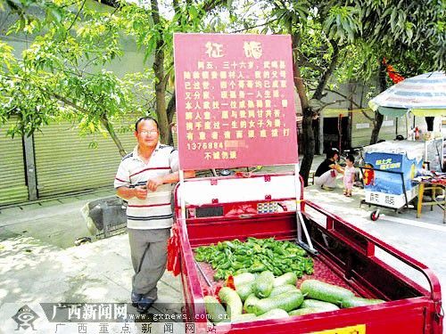 广西壮族自治区武鸣县灵水社区的菜市场里出现一名特别的卖菜男子,他在卖菜的三轮车上竖起一块征婚启事牌,上面写着:“阿五,36岁,父母已过世,4个哥哥均已成家又分家……本人欲找一位成熟稳重、善解人意,愿与我同甘共苦、携手度过一生的女子为妻,有意者请面谈或拨打137……”牌子上还写着“不诚勿谈”。