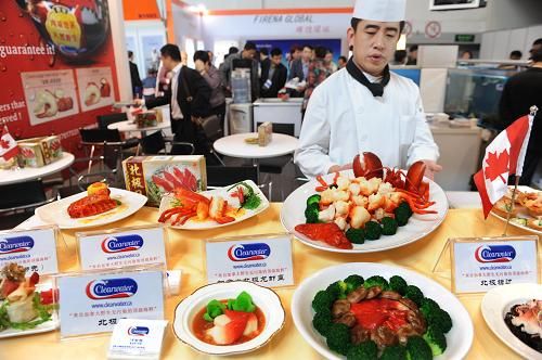 11月2日,一位厨师在加拿大展台现场制作海鲜菜肴。近日,被业界称为世界三大渔业展览之一的第十六届中国国际渔业博览会在山东省青岛市举行,吸引了来自39个国家和地区的近800家参展商参展。展出内容包括水海产品、养殖技术与品种、水产加工及养殖设备等。展会同期,还将举办“2011水产品加工技术对接会”和“第三届生态可持续水产品发展研讨会”。