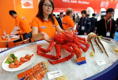 11月2日,一位参展商在介绍从大西洋捕捞的帝王蟹。