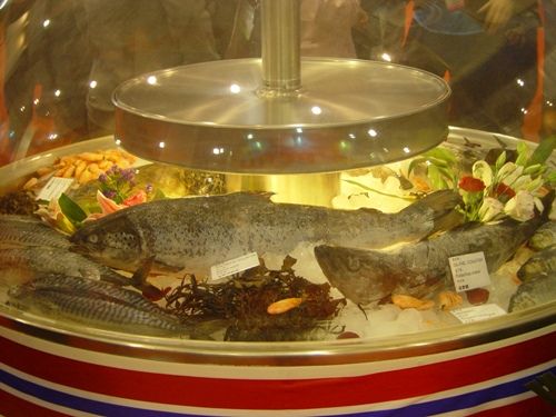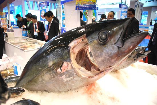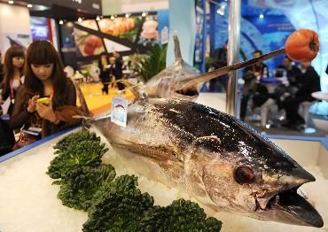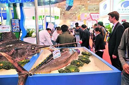 原生态金枪鱼被放在展位前,最大的一条重80斤,市场价3000元左右。