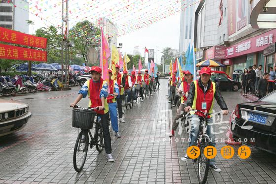 随着一声响亮的发令枪声, 100名共青团志愿者身着鲜艳的红马夹,骑着附有消防宣传彩旗的自行车整齐出发,浩浩荡荡地行驶在霞山和赤坎的大街小巷上,向广大市民宣传“全面消防,生命至上”、“关注消防,关爱生命”、“清剿火患,有你有我”、“构筑防火墙,保人民平安”。