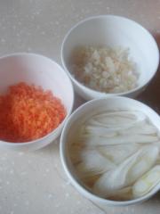 <br/>葱斜刀切片,姜切片,放在碗中,倒入清水,浸泡一些,做成葱姜水备用。胡萝卜切成小颗粒备用,马蹄也切成颗粒,比胡萝卜稍大些。</li><li>2