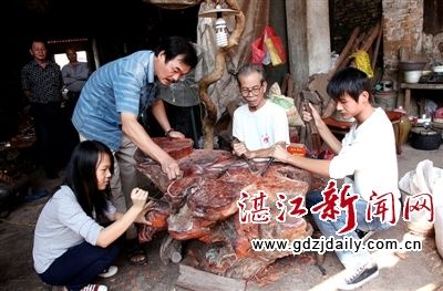 “木艺奇才”王伟雄的根雕事业是由个人形式转变为工厂形式。王伟雄对根艺有着一种特殊的情怀。他从小就喜欢画画雕刻,14岁在村里的神庙画神像,20岁外出从事雕刻工作。那时王雄伟一看到木头,马上两眼发光,像捡到宝贝一样。“我根据木头的天然造型、纹理和色彩,再加上合理的想象,就能创作出各种奇异的根雕作品。”那时的王雄伟把根雕当作一门兴趣,时常利用木头雕刻出各种根艺作品,并逐渐获得他人的青睐。为了让更多的人可以分享自己的创作,王雄伟将这门艺术转化为商业价值。“根雕这个行业虽然给我创作了一定的财富,但让我最感安慰的是,我培养了不少根雕人才。”如今,“馥木天源”在湛江、沈阳、武汉、东莞等城市均有分店。