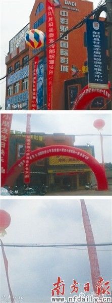 帖子中的照片显示,一条写有“中共射阳县委宣传部祝董××小朋友生日快乐”的红色条幅挂在一家国际影城侧墙上,影城的正门处也有一个红色拱门,拱门上写着“祝××与董××小朋友一起驰骋飞翔”的字样,另还有影城和当地某地产商送出的气球,现场还挂着红灯笼等装饰物,场面盛大,一派喜庆。
