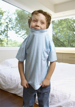 * 实用方法:妈妈可先告诉孩子,找出图案就是正面,然后帮他把衣服穿一半后,让孩子尝试比较简单的动作,例如扣大扣子、拉上裤子、脱掉套在脖子上的衣服(太紧或太小的衣服就不用让孩子自己尝试了)。