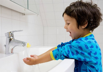 * 实用方法:妈妈可以先帮他打开水龙头,接着帮孩子冲湿,并提醒他不要放太多洗手液或香皂,然后依照步骤协助孩子洗手。