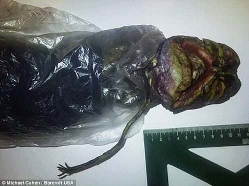 从目前该猛女公布的照片看,这个外星人大概有60厘米长,像一个茄子 :( 目前,据说这具尸体已经被俄罗斯Karelian 研究中心的人带走了。