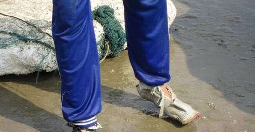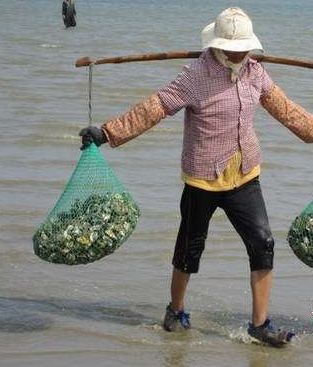 靠耕海为生的沿海村民,为了在海边的礁石上行走自如,为了避免在海边的礁石海滩上拾蚝时不被礁石、海滩散布的蚝壳割伤脚底,自制出实用型的“耕海鞋”,耕海鞋制做相当简单,只需用一双袜子或几块厚布,根据自己的脚的大小,装上绑绳,套上脚后,即可使用。