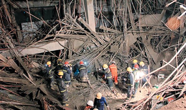 报警十多分钟后,警车、消防车、救护车陆续赶到现场。“我看见两个工人被抬了出来,头上都是血,全身上下沾满了水泥。”另一目击者老陈说,现场有许多人围观,警方在工地四周拉起了警戒线,数名被困工人被救后坐在一边休息,并无大碍。而多名闻讯前来的工人家属因情绪激动,不顾警察劝阻强行进入事发工地。
