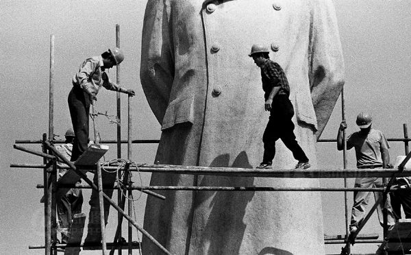 盛夏,一群工人正在为移动一座塑像做准备。