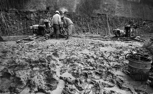 工人们在满是泥浆的基坑里打锚杆。