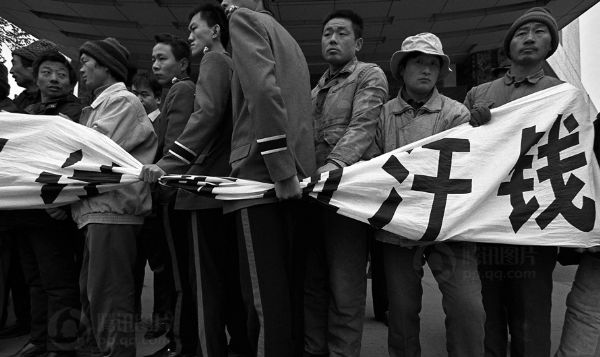 年底,讨工钱的民工在自己亲手盖起来的大楼门口和保安发生了冲突。