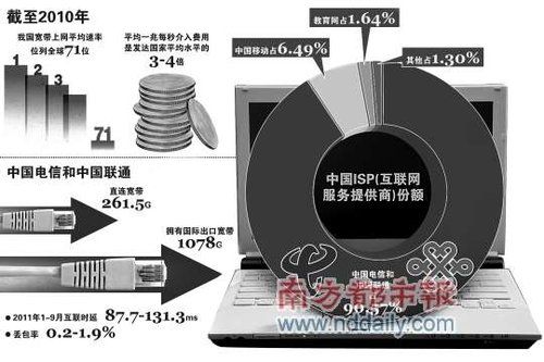 目前,中国60%的宽带接入用户、65%的内容资源、62%的国际出口带宽集中在中国电信,网间互联总流量中有83%流经中国电信网络;中国联通的宽带接入用户、内容资源大约是中国电信的一半,国际出口宽带占33%;其他运营商的市场占比不足10%。