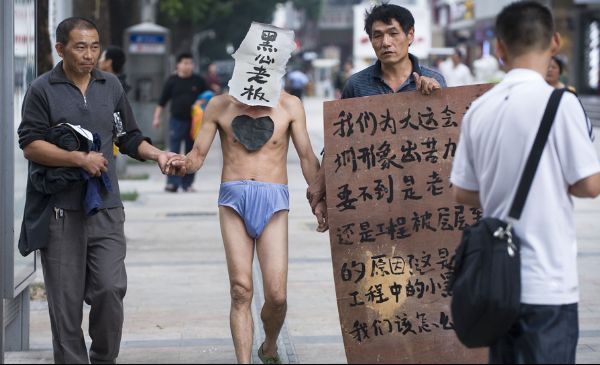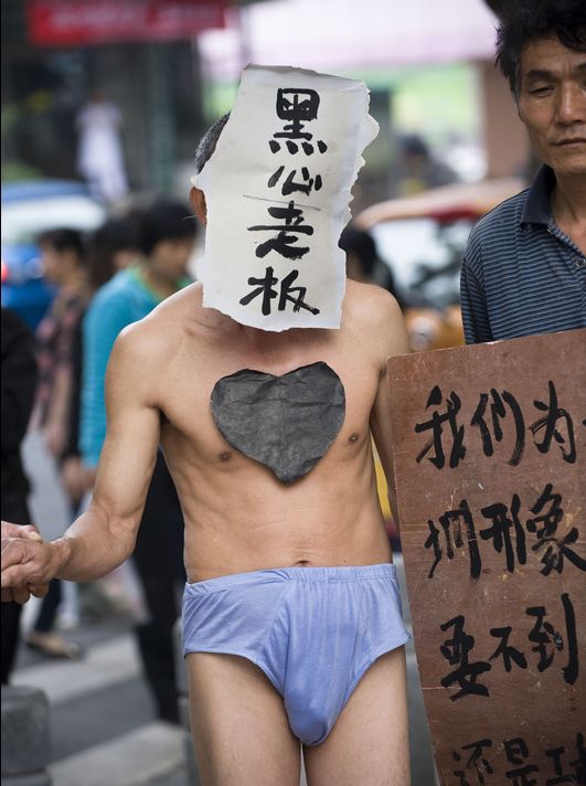 身着三角裤,脚穿“解放鞋”,胸前胸后贴着一个黑色的心形剪纸,头戴一副面具,上书“黑心老板”,一左一右两人押着此副装扮者游街。昨日下午4时20分,福田区东园路路边突然出现上述一幕,顿时围观者众。