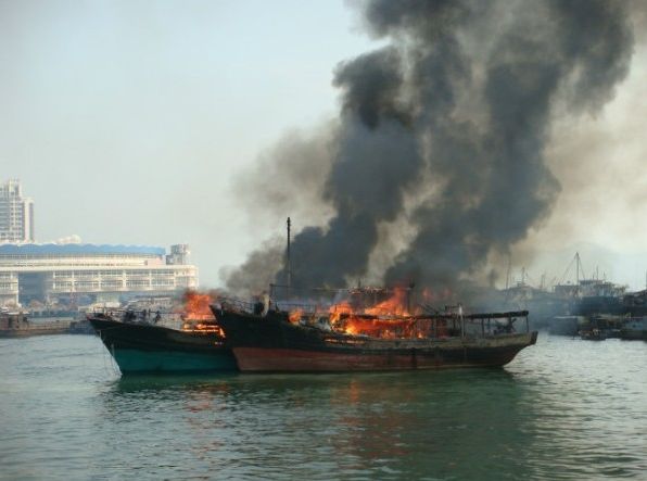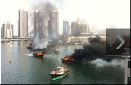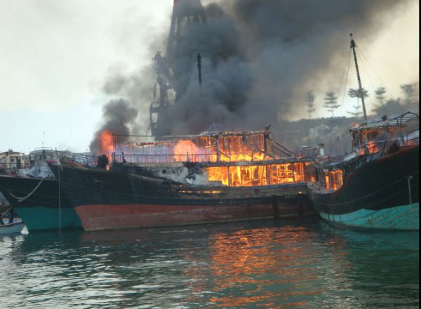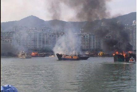 继上个月20日3艘暂扣船只被烧,昨日下午2时许,深圳南山区蛇口渔港南端的利安码头再次起火,6艘暂扣船只被烧。大火在下午5时许被扑灭,无人员伤亡。