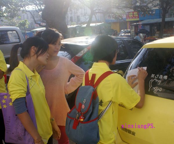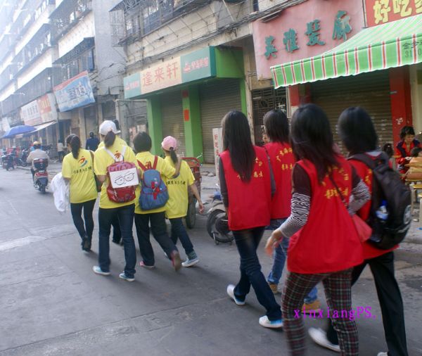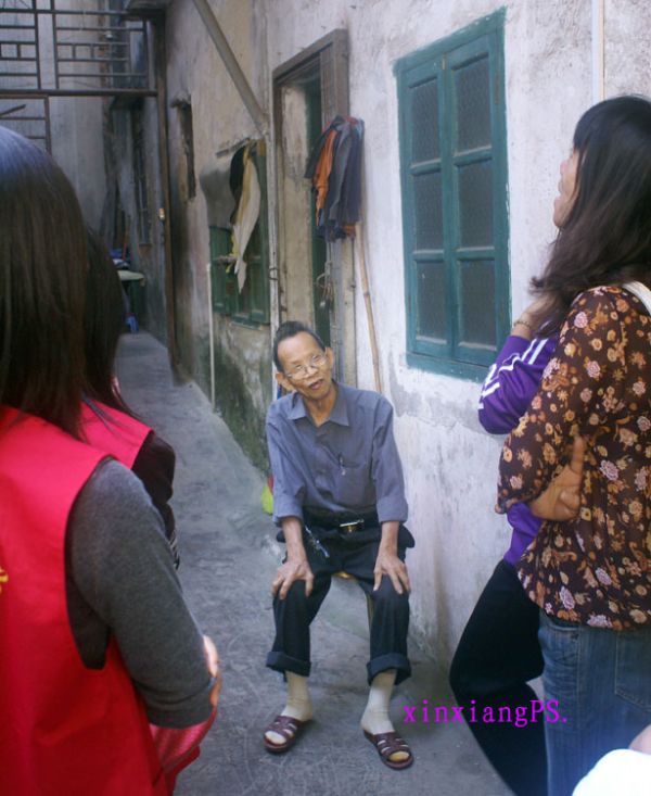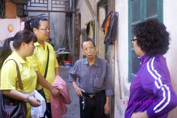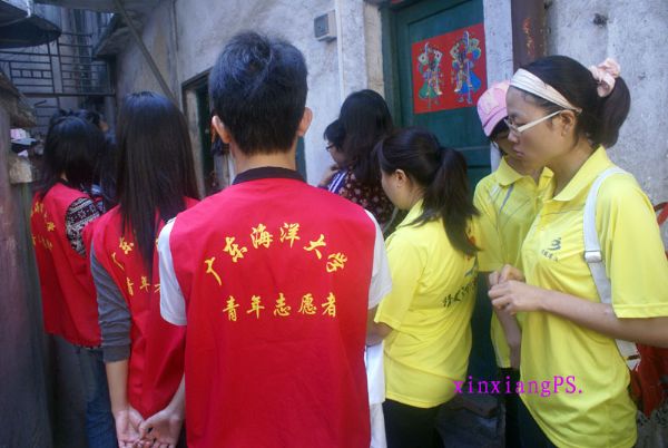 参加这次活动海洋大学的志愿者们都是大一、大二的学生,他们穿上显眼的红马褂穿街走巷。首先来到敬老院与大伯聊天,然后又到双眼失明、半身不遂、患癌症的梅姐处去与她近距离接触,握手、谈心、时不时从屋里传出梅姐与志愿者们的笑声,海洋大学的志愿者们还送给梅姐歌曲《对面的女孩看过来》以此来鼓励梅姐不要理会他人对自己的看法,要勇敢地面对事实、坚强的生活下去。歌声和笑声传遍整个社区的每个角落,还吸引来了附近的居民们。这一天梅姐笑得很开心,她告诉笔者这是她最开心的一天,不要寄托于听取录音机来度过一天而是有人愿意与自己交谈、、、、、她笑得是多么的灿烂。可见她是多么需要社会上人们的关爱!