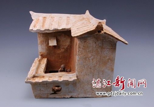 这座陶屋是在徐闻五里乡二桥村那涧闸东坡汉墓出土的,同时,还出土了精致的铜铺首、五铢钱、陶盆、陶壶盖、陶灶等陪葬品,从这些陪葬品中可以看出墓主在当时应有一定的社会身份。