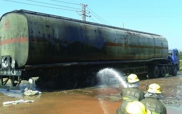 眼前的景象让消防官兵惊出一身冷汗,熊熊烈火已经将整个槽罐车后部重重包裹,槽罐车周围水泥路面犹如鞭炮般四处炸裂,四处散发着浓烈的刺激性气味。经询问得知,事因一辆满载53吨工业用酒精槽罐车右侧后轮胎着火,由于司机在处理事故时操作不当导致一阀门出现损坏,致使大量的酒精一涌而出,导致现场成为一片火海。由于酒精燃烧为蓝色火苗,在白天难以用肉眼判断明火的准确部位,而且事故现场附近都是工厂和民房,特别是边上一工厂内部储存大量油料,人多车辆多危险化学物品多,一旦险情不能控制导致53吨酒精槽罐车发生爆炸,后果将不堪设想。