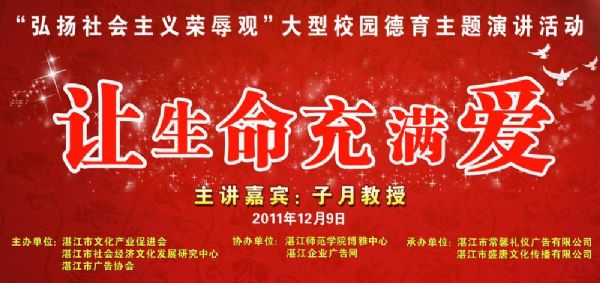 为了提高大学生“爱父母、爱老师、爱自己”的思想品德。定于2011年12月9日举办《让生命充满爱》演讲活动。由广东省文化传播学会中国时代之声演讲团子月教授主讲。欢迎广大师生踊跃参加。