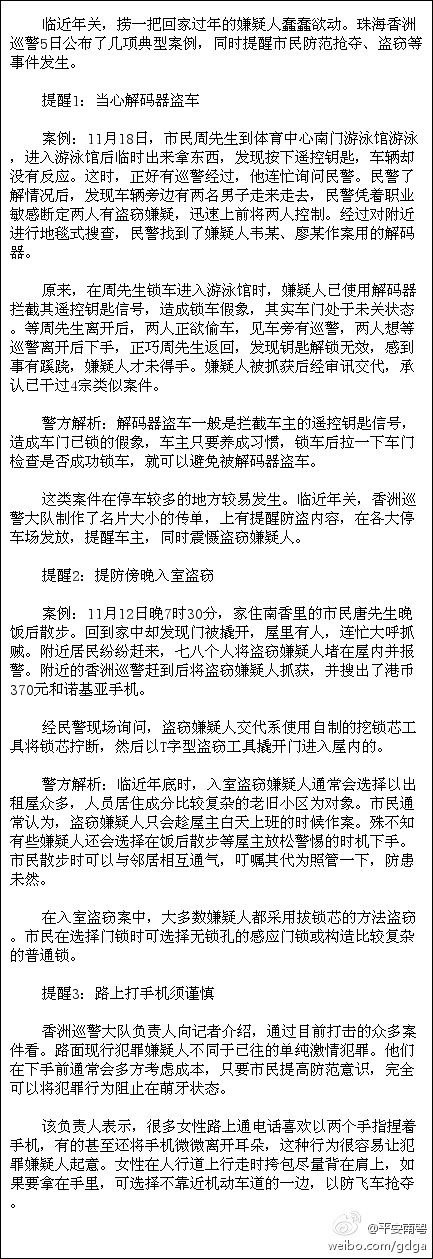 <em style="font-style:normal;">12月5日珠海警方公布了几项典型案例,提醒市民防范解码器盗车、傍晚入室盗窃、飞车抢夺手机等事件发生,也提醒网友加强安全防范,如遇犯罪行为,及时拨打110热线报警处理。</em>