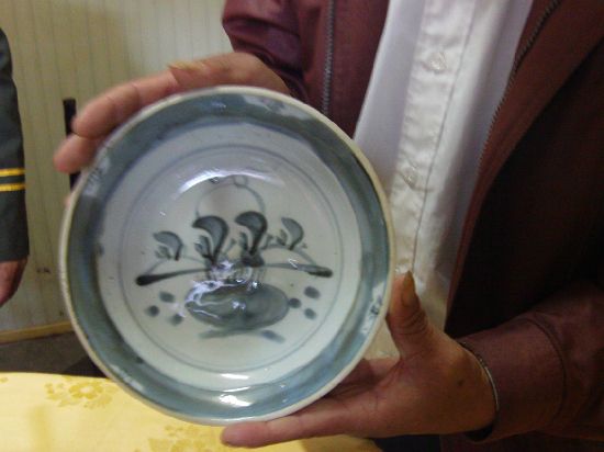 12月3日,特地赶往雷州市唐家镇乌树村吴妃卓的家,看到了这个刚刚破土而出的“古董”。横目一瞥,宝物与一般的陶瓷盘并无两样,轮廓、大小、形状相差无几。但仔细一看,则会发现陶瓷盘做工相当精细,盘面与盘底均雕琢着各种花纹,形如浮云,宛若蛟龙,且色泽光艳夺目。