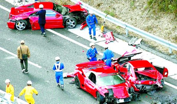 为首的法拉利车司机是名60多岁的男子,他驾车上坡行至一个大拐弯时,汽车失控撞上了马路中间的护栏,被护栏弹回来后又与一辆奔驰车相撞。由于相撞的两辆汽车恰好在拐弯位置,影响了后面汽车的视线,于是一辆接一辆的汽车撞到了一起。据统计,这次车祸有14辆车遭殃,包括8辆法拉利跑车,3辆奔驰,1辆兰博基尼和2辆日产跑车,总损失超过250万英镑。追尾车辆均为高级跑车,属于日本一个跑车俱乐部。