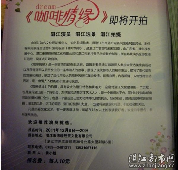 湛江第一部电视剧《咖啡情缘》即将开拍,年龄在16岁以上的表演爱好者都可以来报名演员哦[鼓掌] !有意的朋友可以参考图片上面的报名方式,也许这次主角就是你哦!