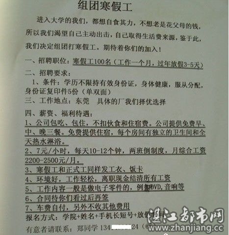 笔者于湛江某大学发现,该校校园各处都张贴着招收寒假工的宣传单张。笔者发现,今年企业招收寒假工的策略有变,现今的企业不再满足于只招收少部分的学生做寒假工,很多企业在今年都推出了——组团招收寒假工的政策。笔者就在其中一张宣传单张上看到,该宣传单张上显示,该企业招收组团寒假工100名,需要在东莞的工厂工作一个月,但是,该宣传单张并未表明寒假工人具体工作的工厂位置,只是模糊地表明,会择优选择工厂。宣传单张上的信息还包括了寒假工具体的薪资以及福利待遇。招聘的条件是——学历不限,但是需要应聘者持有效身份证,身体健康,还要服从分配。